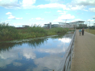 An ‘environmentally friendly’ Sainsburys store was opened in early September 1999 at the S.W. corner of the Peninsula site nearest to the A102 flyover. Now the proud winner of multiple awards, the use of refrigeration coolant within an underfloor heating system, extensive use of earth banking to retain/conserve heat at relevant times of the year, together with a pond for water recycling and an Internet ordering and home delivery service using battery-powered vehicles have all been included in the development. This latter idea was the subject of a letter from the Westcombe Society’s Environment Committee Chair to English Partnerships in 1998, so it is nice to think local residents might have had some impact on the scheme.
